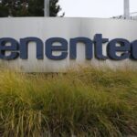 A sign is posted in front of a Genentech office on June 12, 2025 in South San Francisco, …
